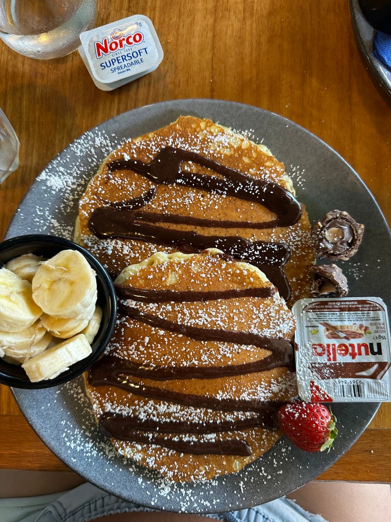 Como o camping não tinha cozinha – ou seja, sem geladeira – acabamos tendo que fazer mais refeições fora do que o planejado e o café da manhã foi no Pancake Place ($43.80 três refeições), muitoooo gostoso e uma variedade bem legal. Recomendo super! Ali do lado também tem um parquinho bem legal aonde ficamos o restante da manhã.