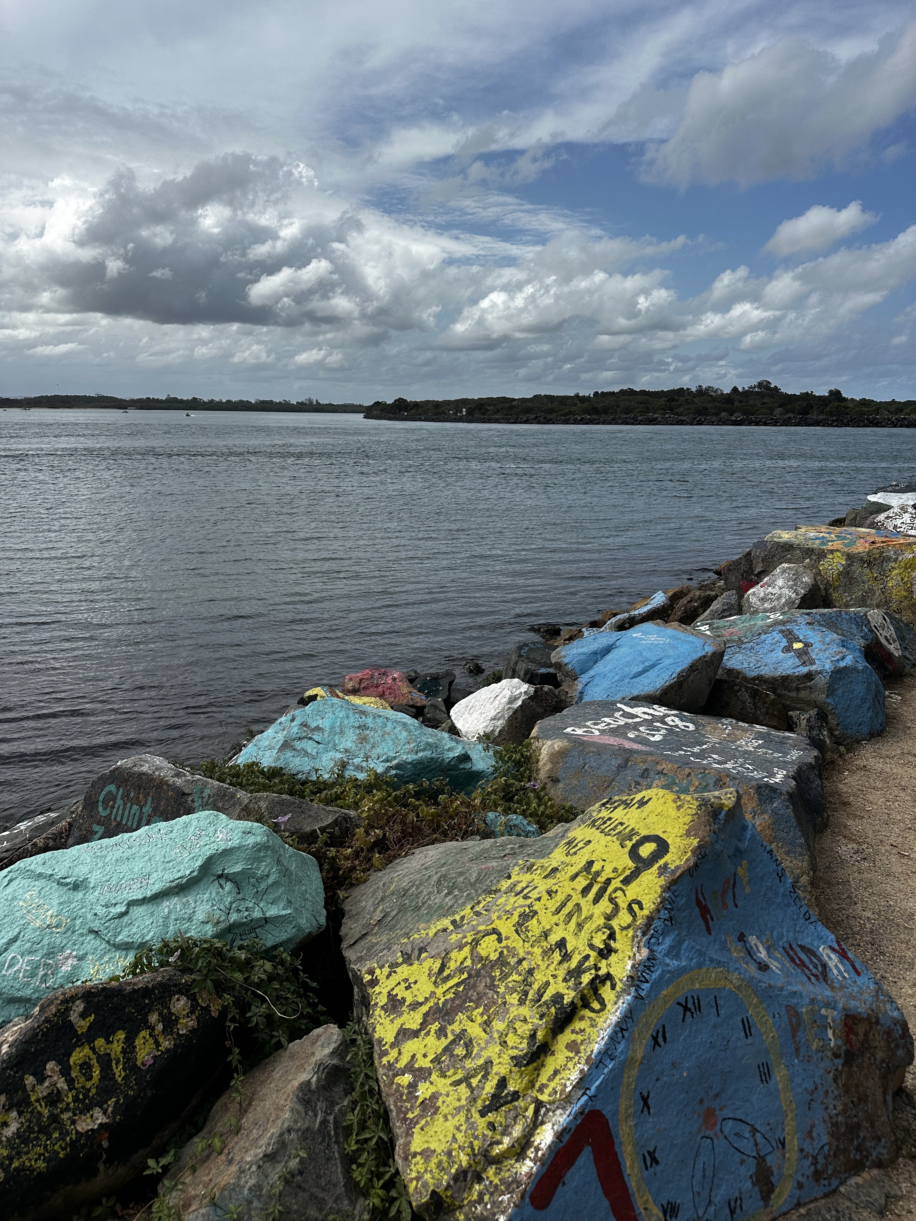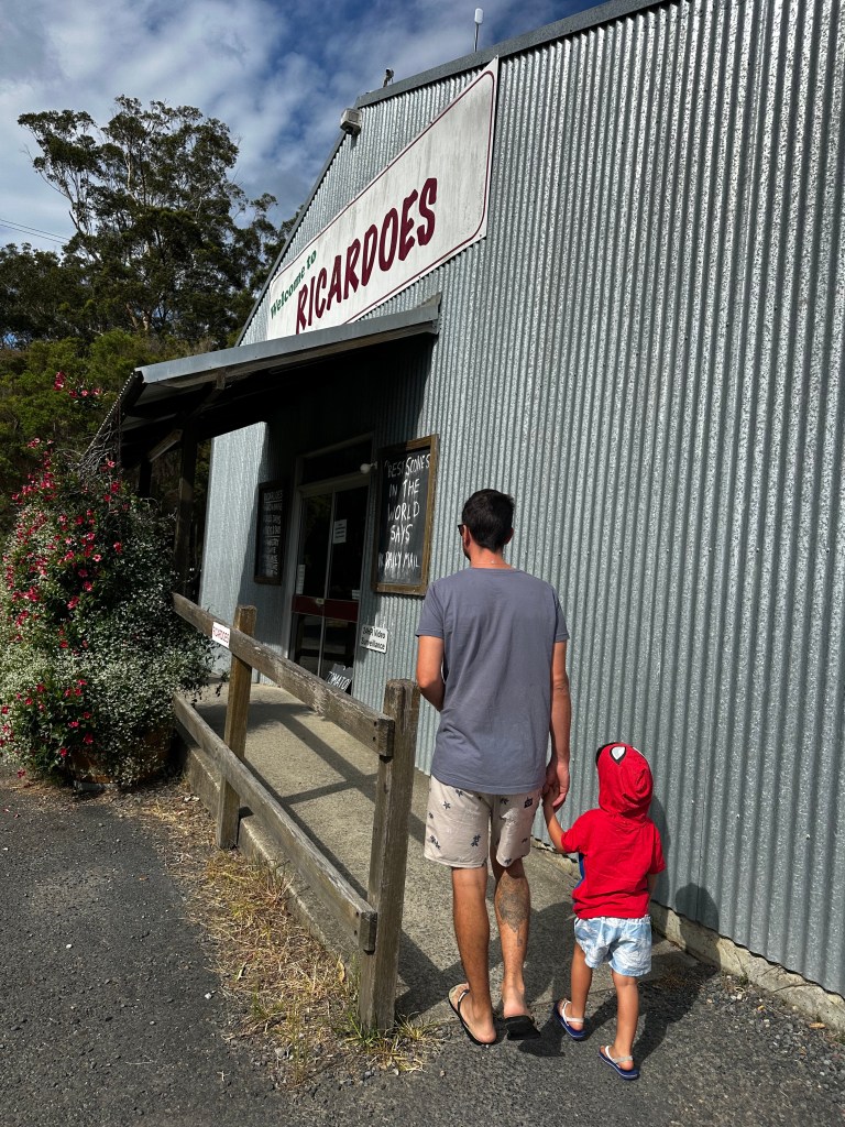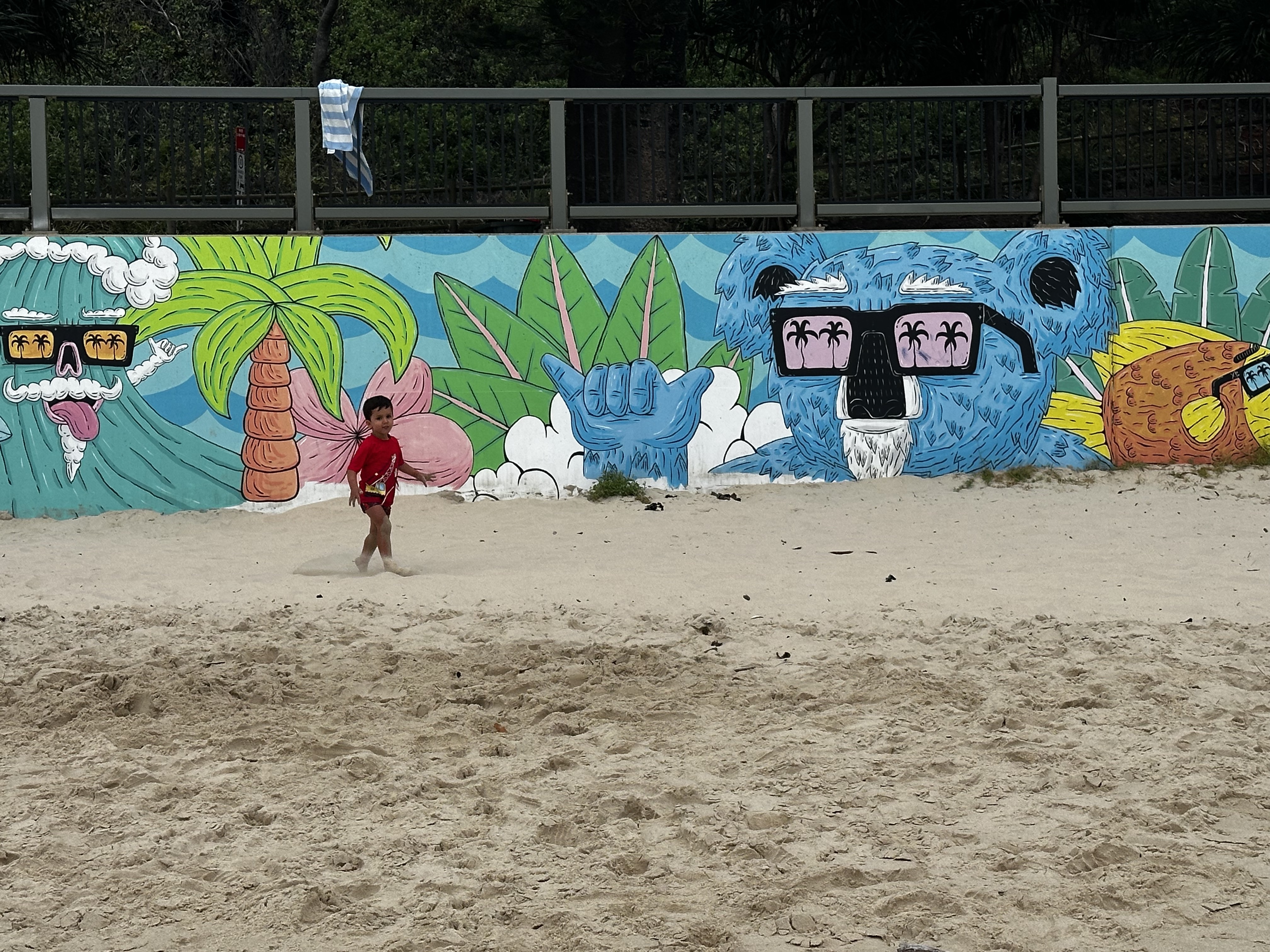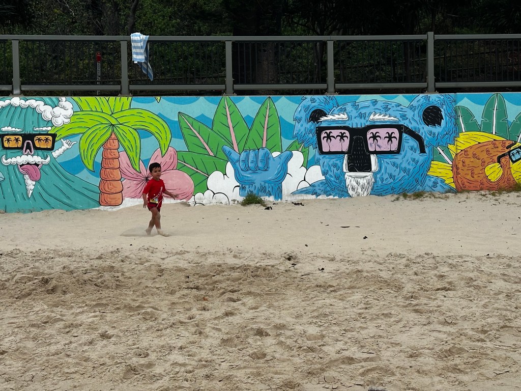 De lá fomos na Flynns Beach aonde passamos o resto da tarde. Mais uma praia cheia de formações rochosas que eu adoro com direito a mural de arte! Saindo de lá, passamos no supermercado para comprar uma massa para jantar antes da virada do ano, sim já era dia 31 de Dezembro!! – e umas bebidas para comemorar. Do nada, meu filho passou mal, acho que comeu um blueberry que não estava legal mas forte como ele é, passou mal e já estava correndo de novo.