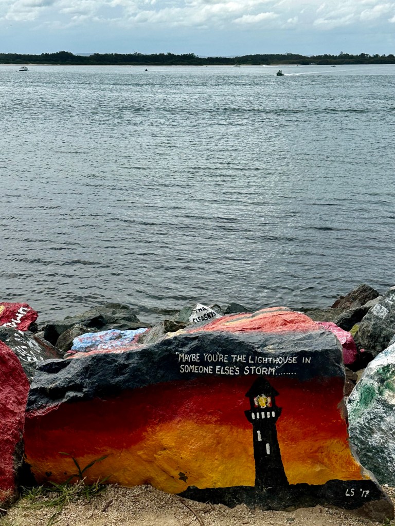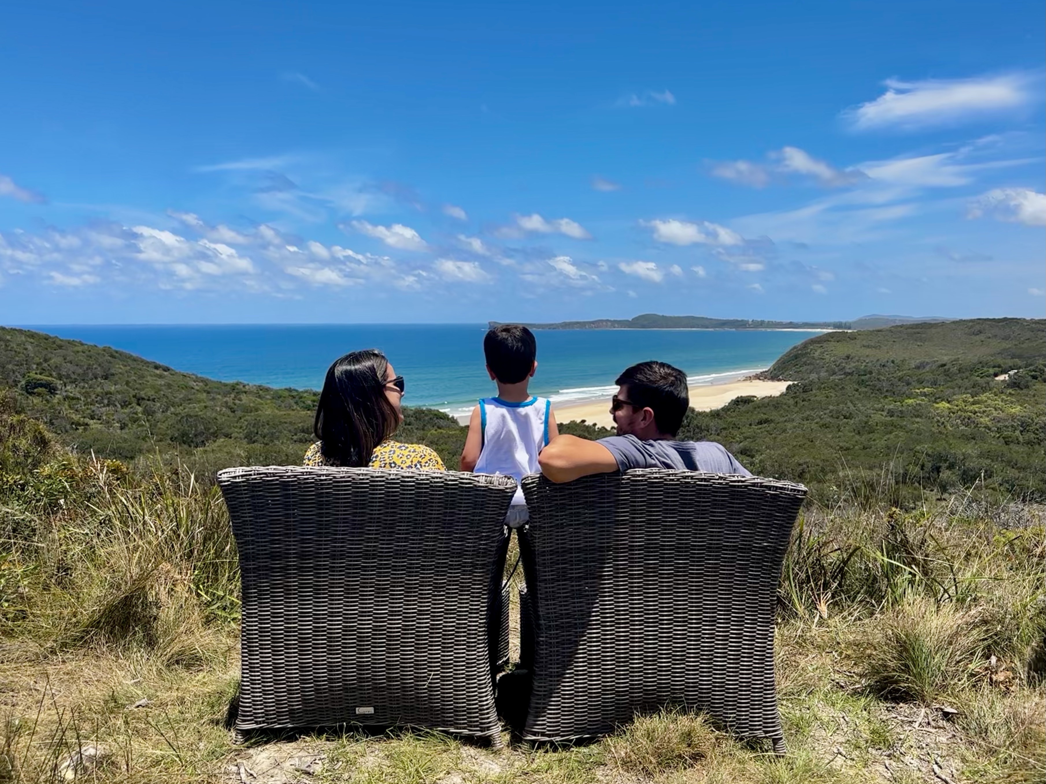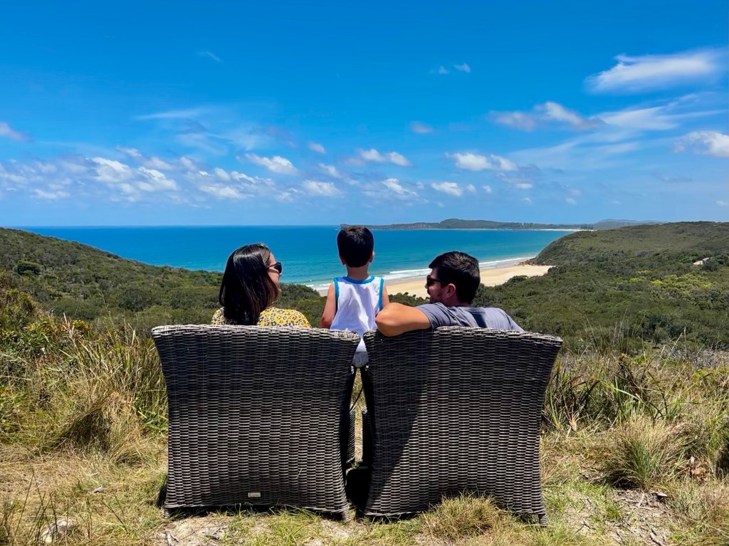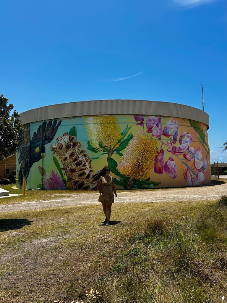 Quem me segue aqui, sabe que eu amo arte de rua e grafites, então fomos ver um no tanque de água (Bonny Hills Water Tank Art). Fica bem pertinho do Lake Cathie, dava para ter ido no mesmo dia. Achei bem bonita a pintura mas adorei também a vista – e as poltronas colocadas propositalmente para apreciar a praia.
