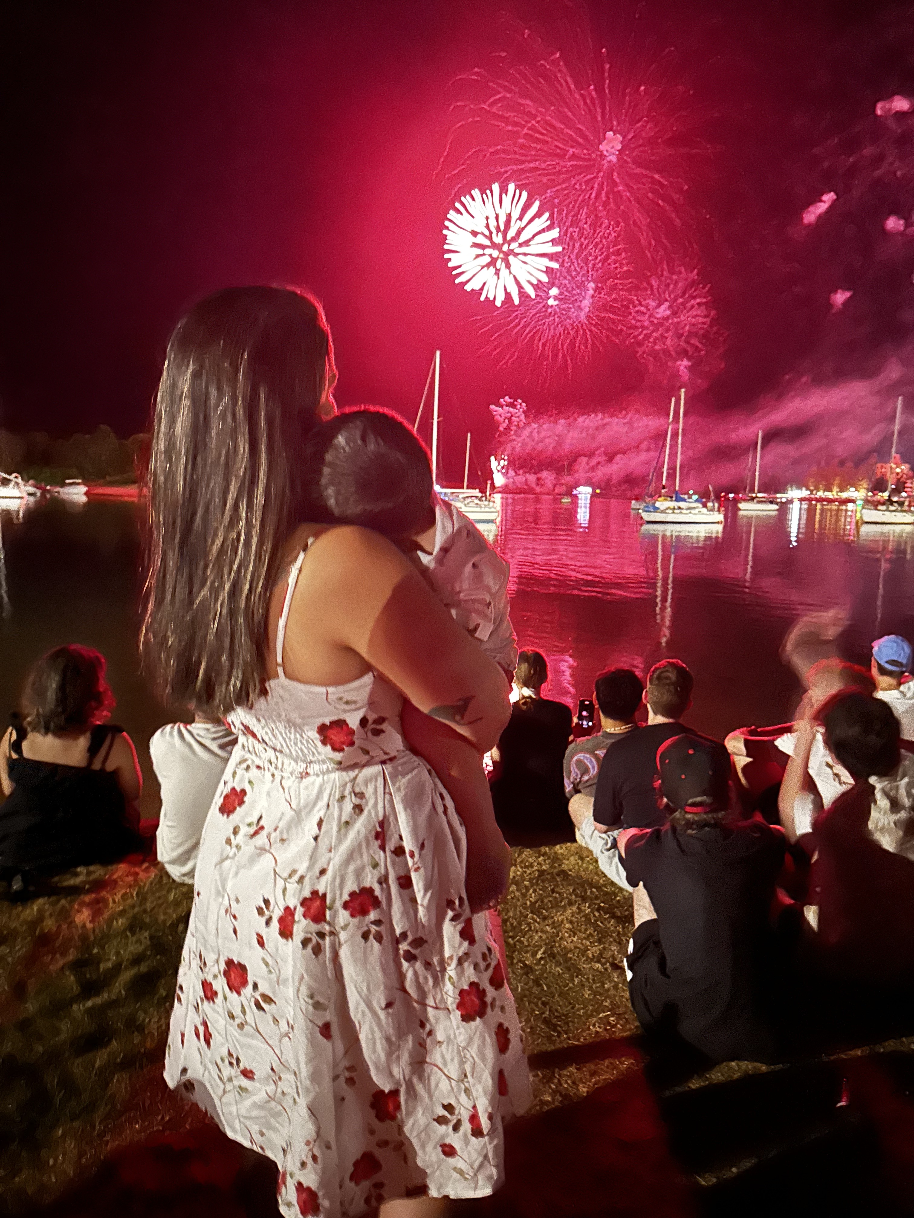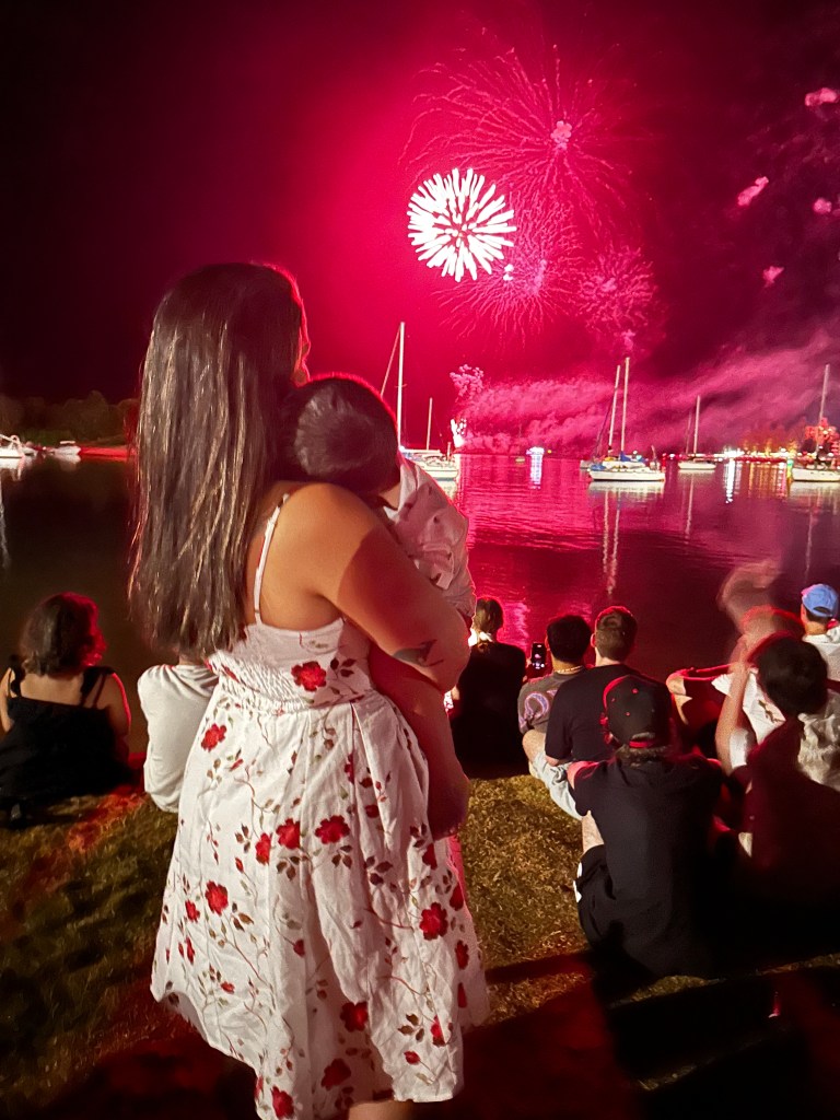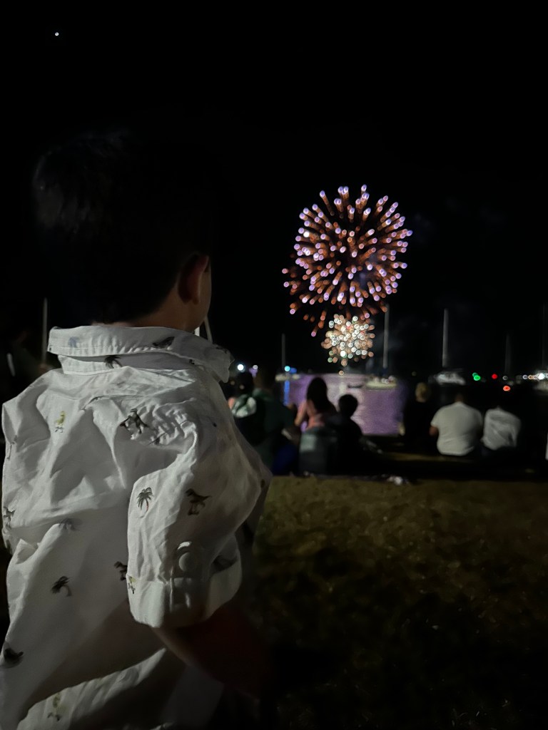 Eu diria que 80% das pessoas foram embora quando acabou, mas nós ficamos, com nosso cooler, tranquilos, bebendo e conversando. Nosso filho dormiu no carrinho assim que os fogos das 9 acabaram e sabia que assim ficaria a noite toda. Uns quinze minutos pra meia noite voltou a chegar um pessoal, nos ajeitamos e esperamos os fogos para comemoramos a virada do ano! Feliz 2025!!!! Como de costume aqui, acabou os fogos, casa – no nosso caso, camping não sem antes uma breve parada na Town Beach para pular as 7 ondinhas.