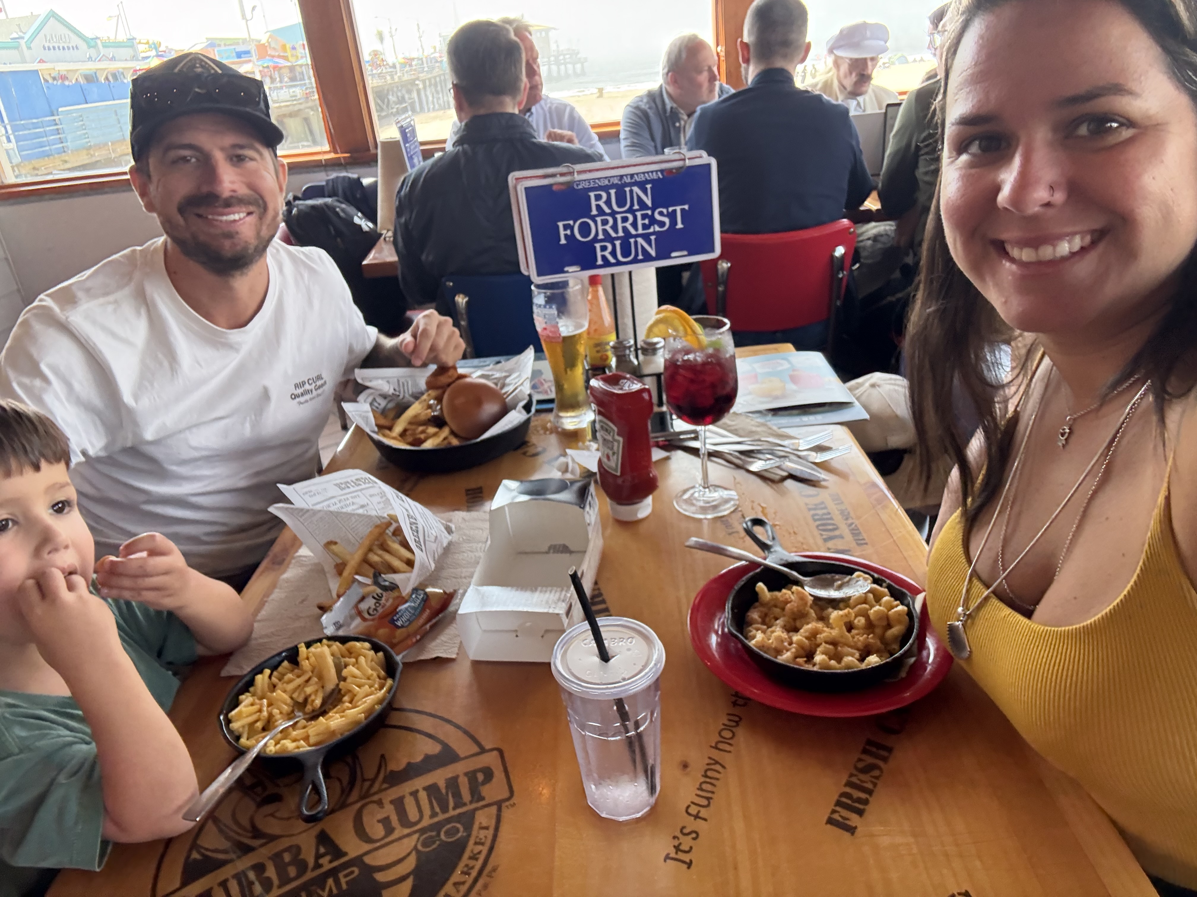 As coisas no píer começam a funcionar 11am e como estava cedo, pegamos tudo abrindo. O dia tava lindo, um sol de rachar. Tiramos umas fotos, brincamos num Arcade que tinha lá e íamos no parquinho mas antes decidimos almoçar no Bubba Gum Shrimp Co – famoso por conta do filme Forrest Gum. A comida estava bem gostosa, pedimos uma bebida cada e uma sobremesa também mas achei caro (AUD150 total).