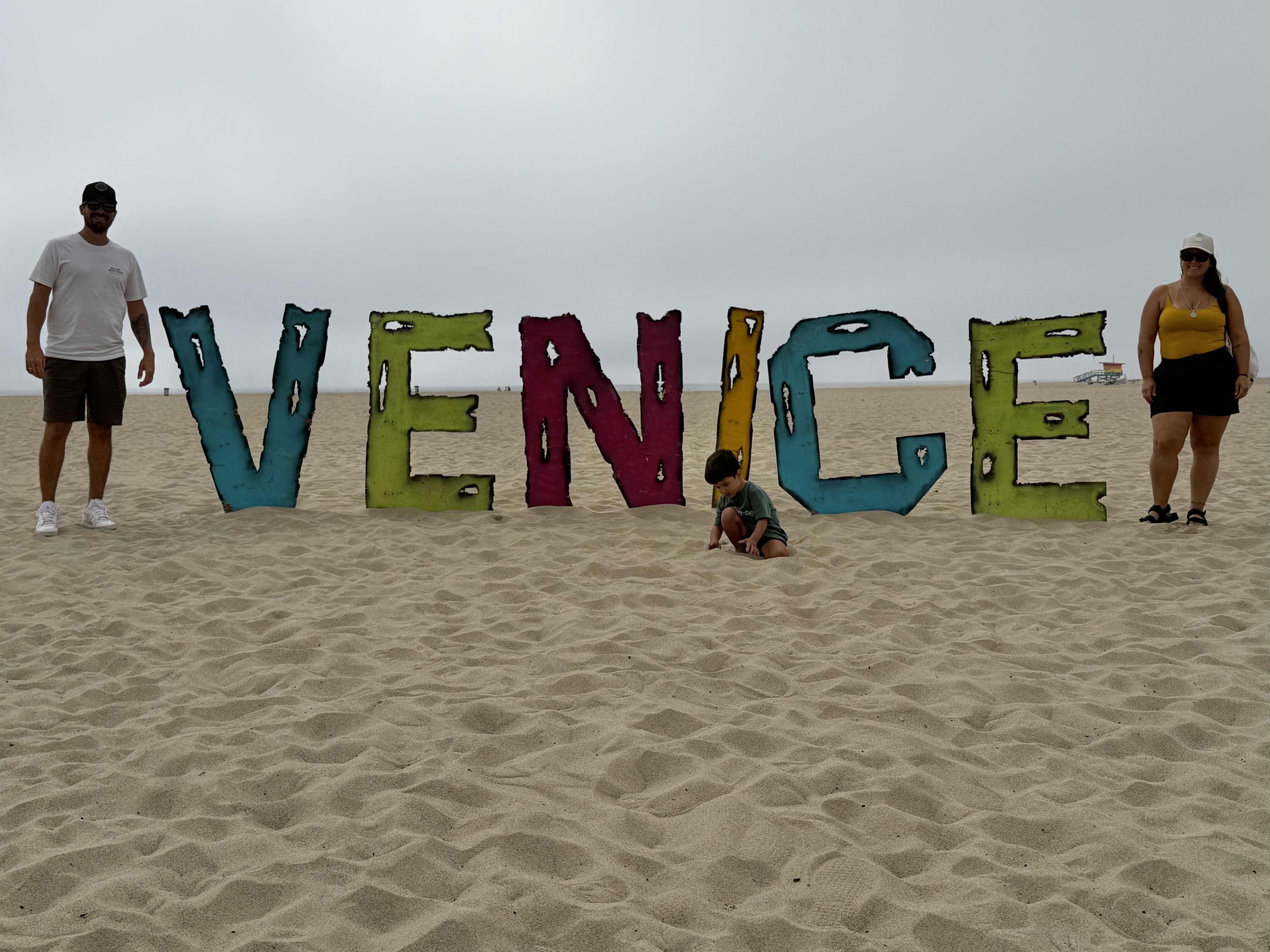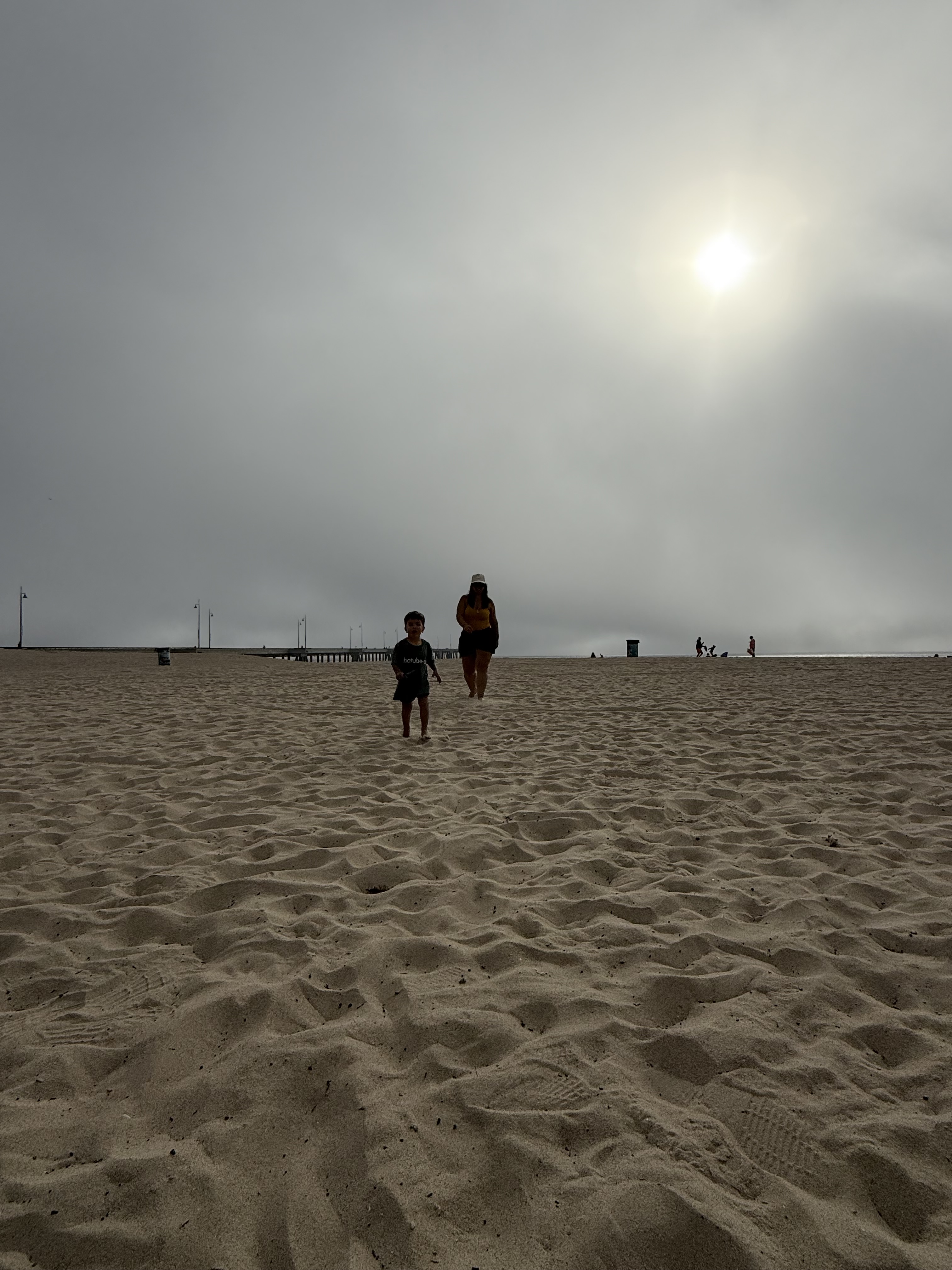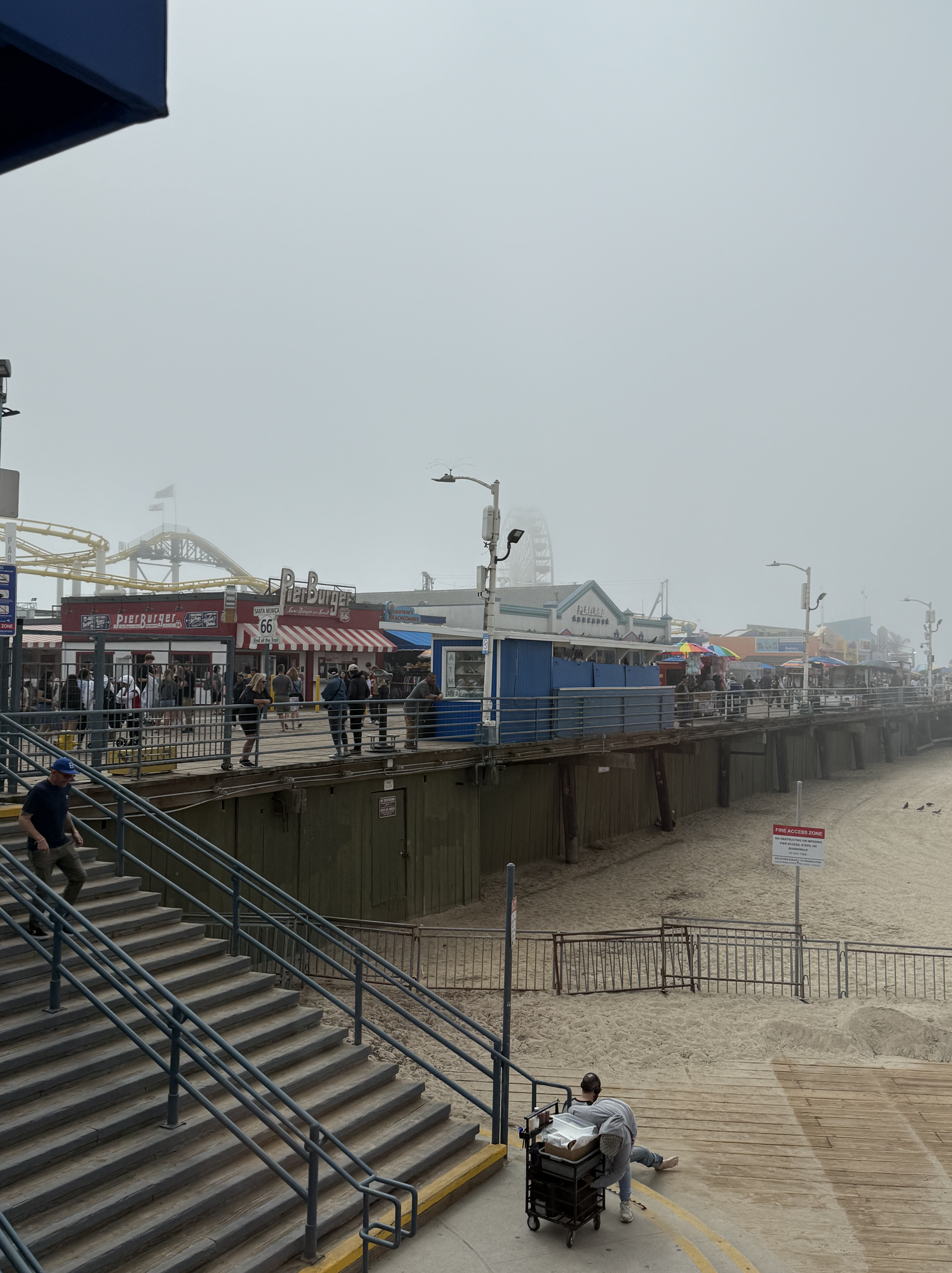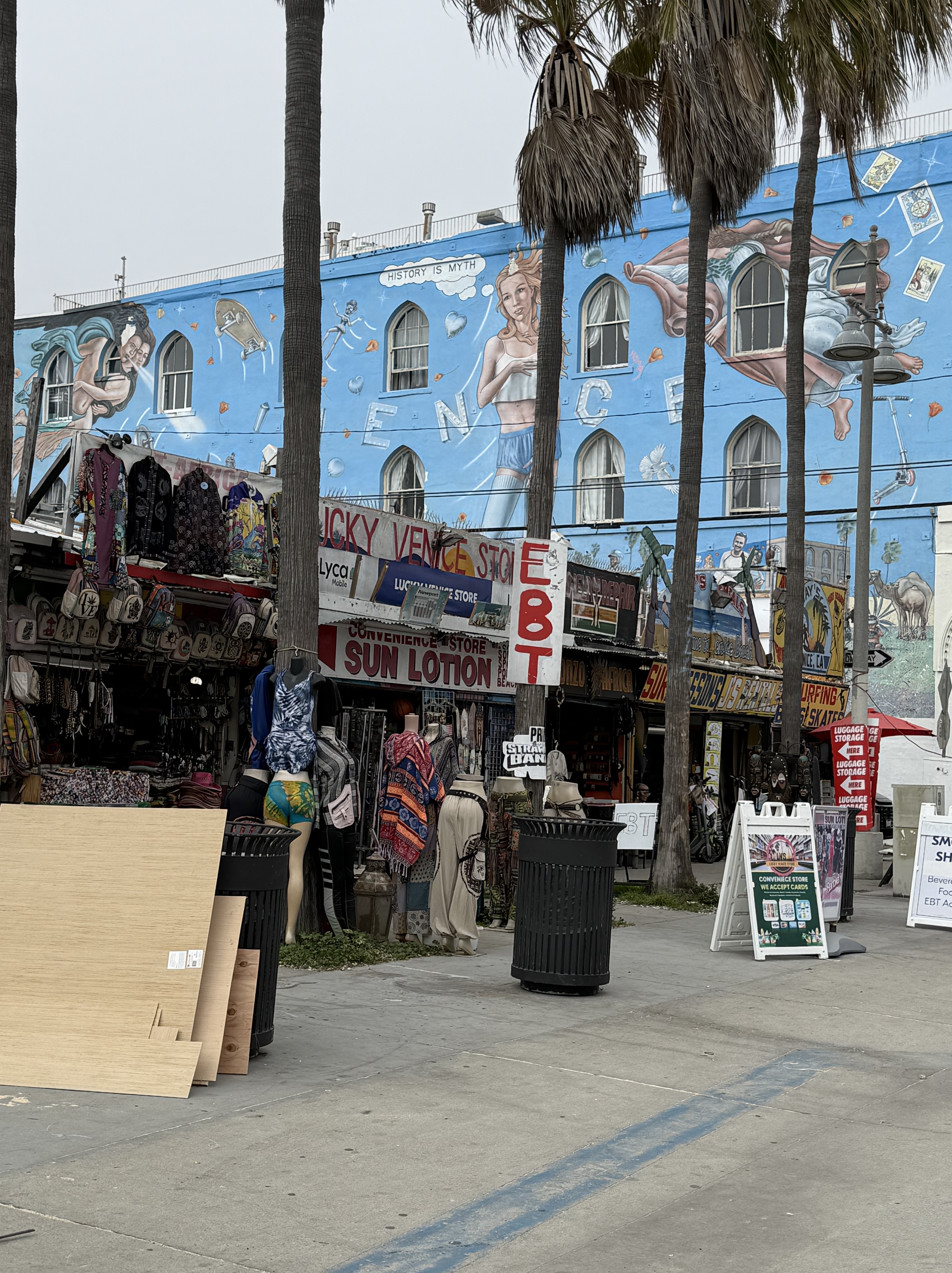 Nessa 1 hora e pouco que ficamos comendo, o tempo virou completamente, uma névoa/maresia/sei lá o que cobriu tudo e mal se via a roda gigante do parquinho no píer mais – além de ter esfriado. Fomos andando pela orla até Venice que era o plano inicial de qualquer forma na esperança que nosso filho dormiria no trajeto já que dá uns 40min caminhando – só que não hahaha. Achamos um parquinho no caminho e ficamos um pouco por lá antes de chegar no lugar que mais gostei de LA: Venice Beach!