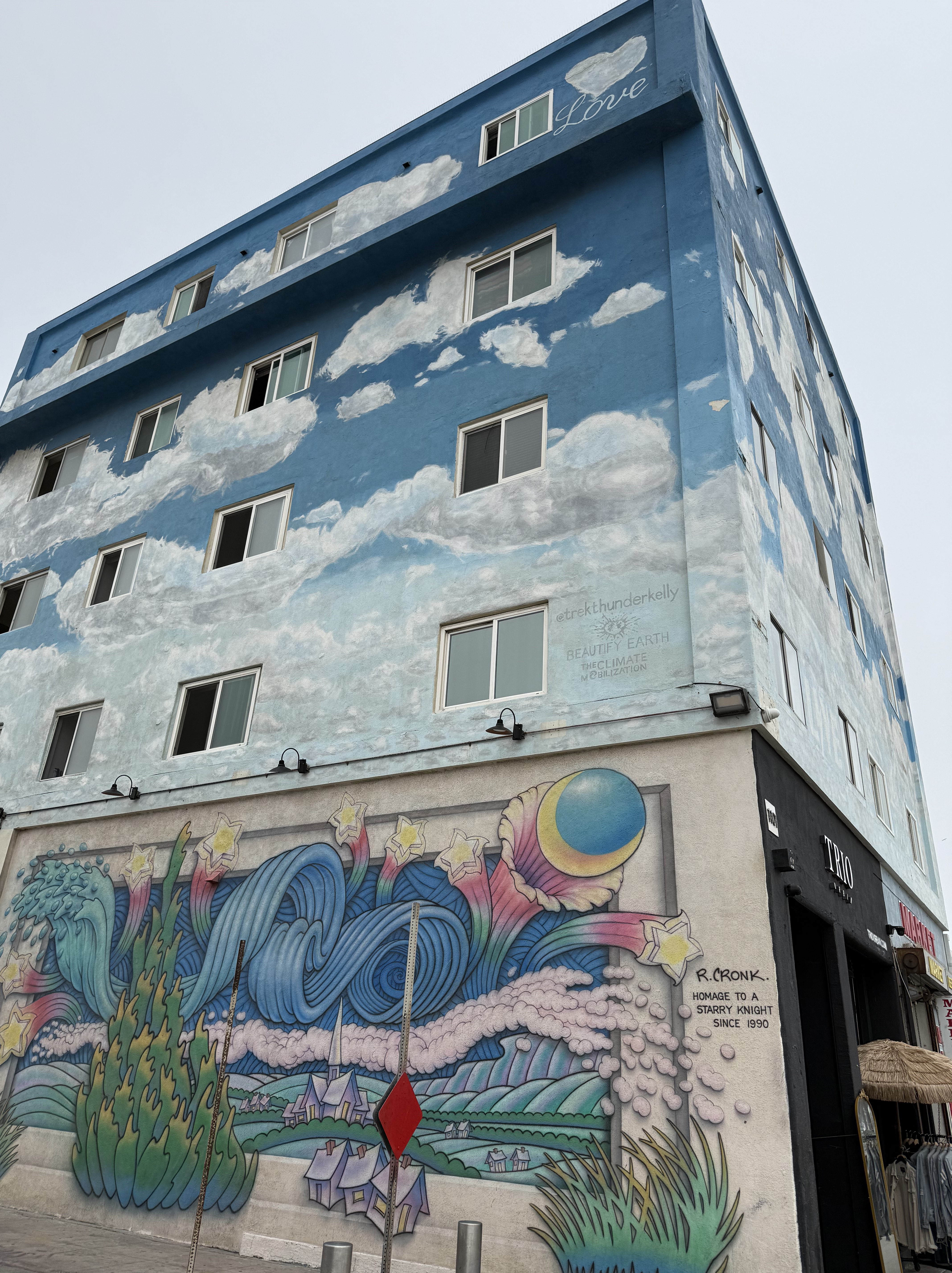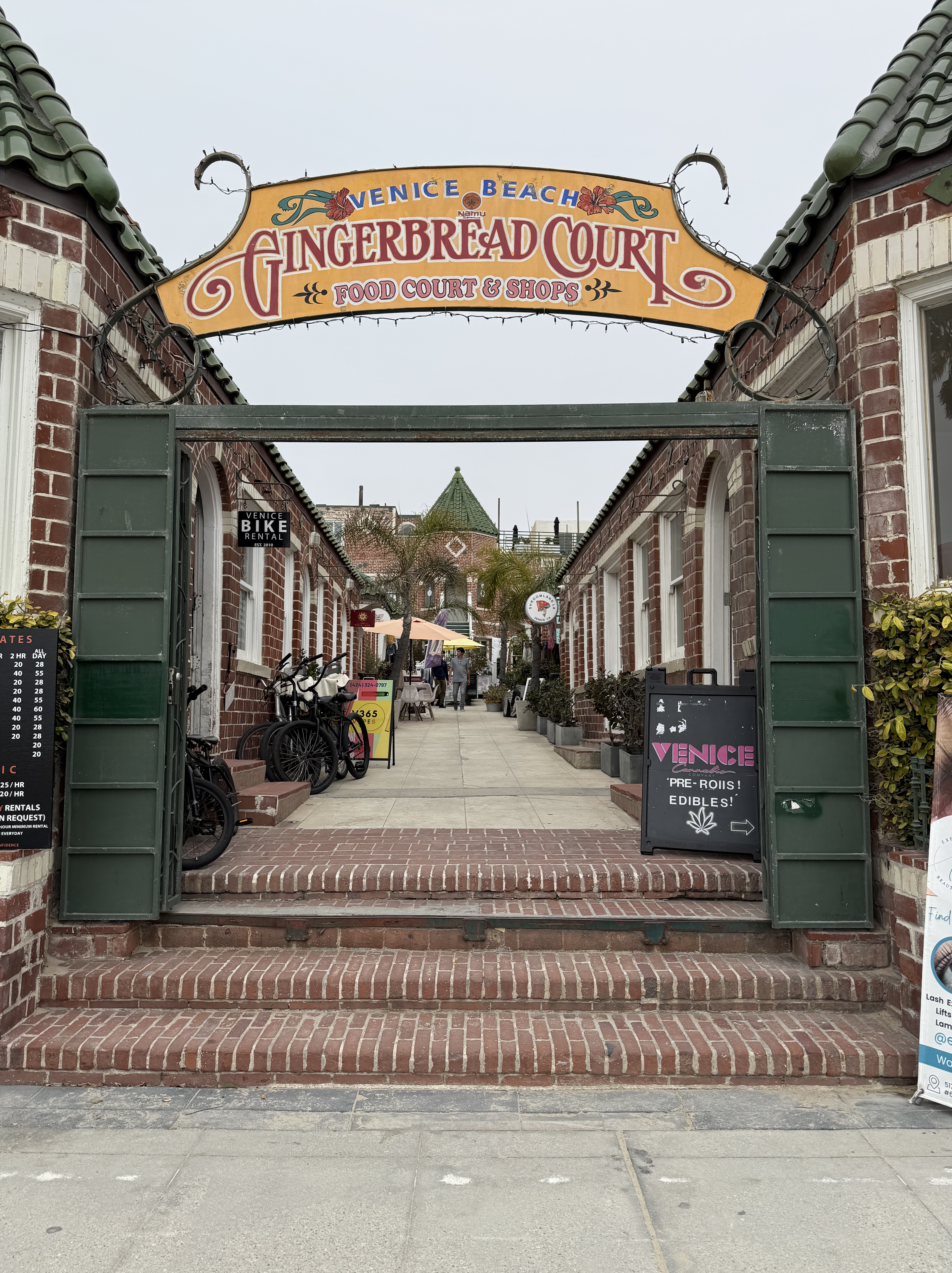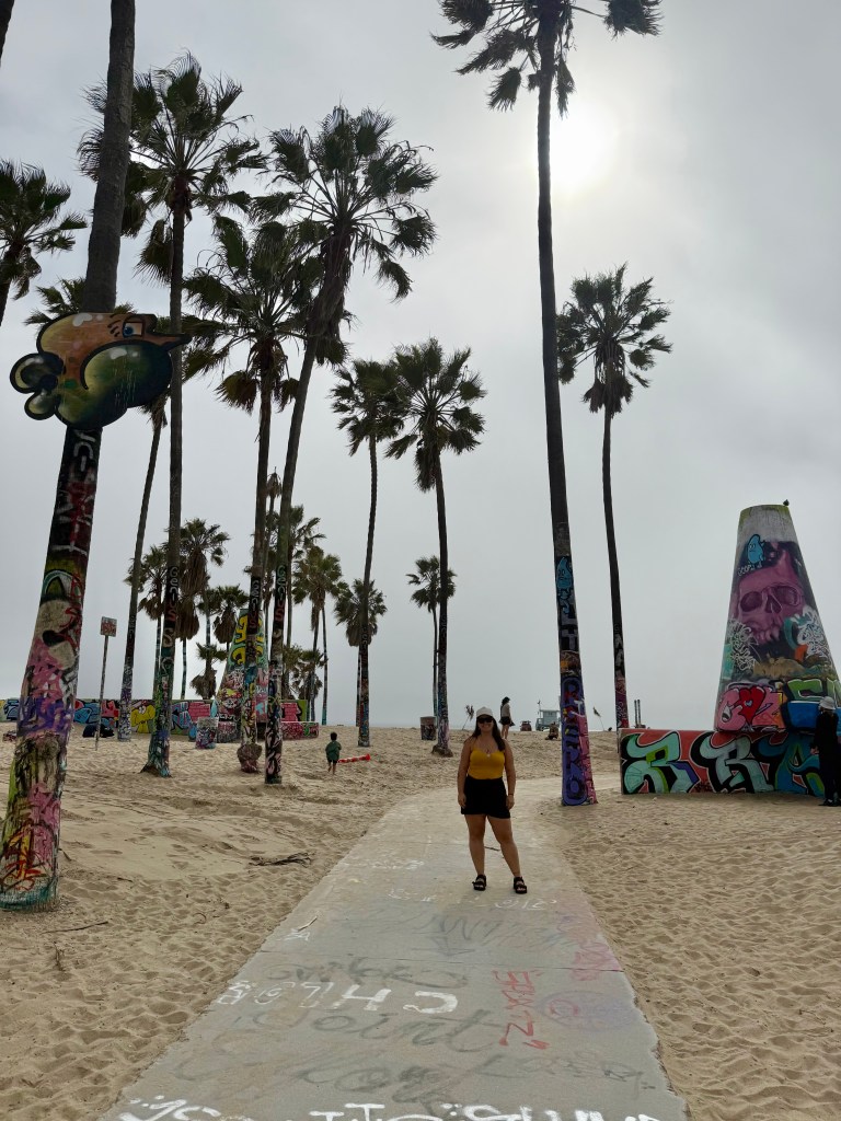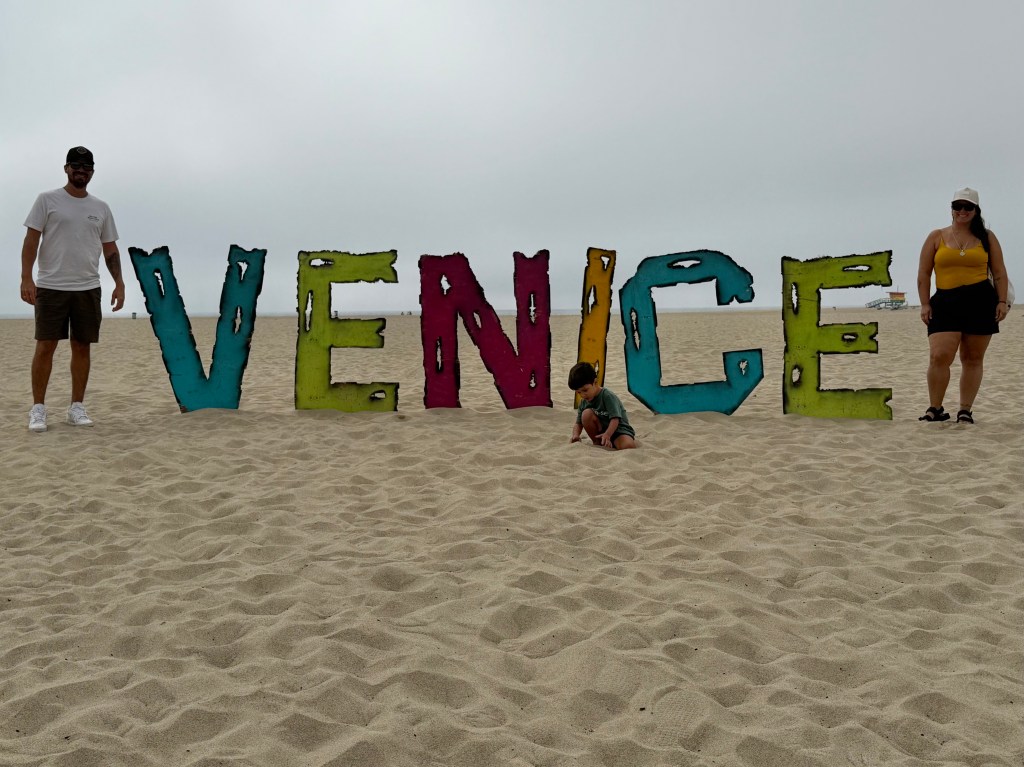 Nessa 1 hora e pouco que ficamos comendo, o tempo virou completamente, uma névoa/maresia/sei lá o que cobriu tudo e mal se via a roda gigante do parquinho no píer mais – além de ter esfriado. Fomos andando pela orla até Venice que era o plano inicial de qualquer forma na esperança que nosso filho dormiria no trajeto já que dá uns 40min caminhando – só que não hahaha. Achamos um parquinho no caminho e ficamos um pouco por lá antes de chegar no lugar que mais gostei de LA: Venice Beach!