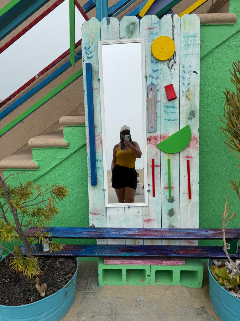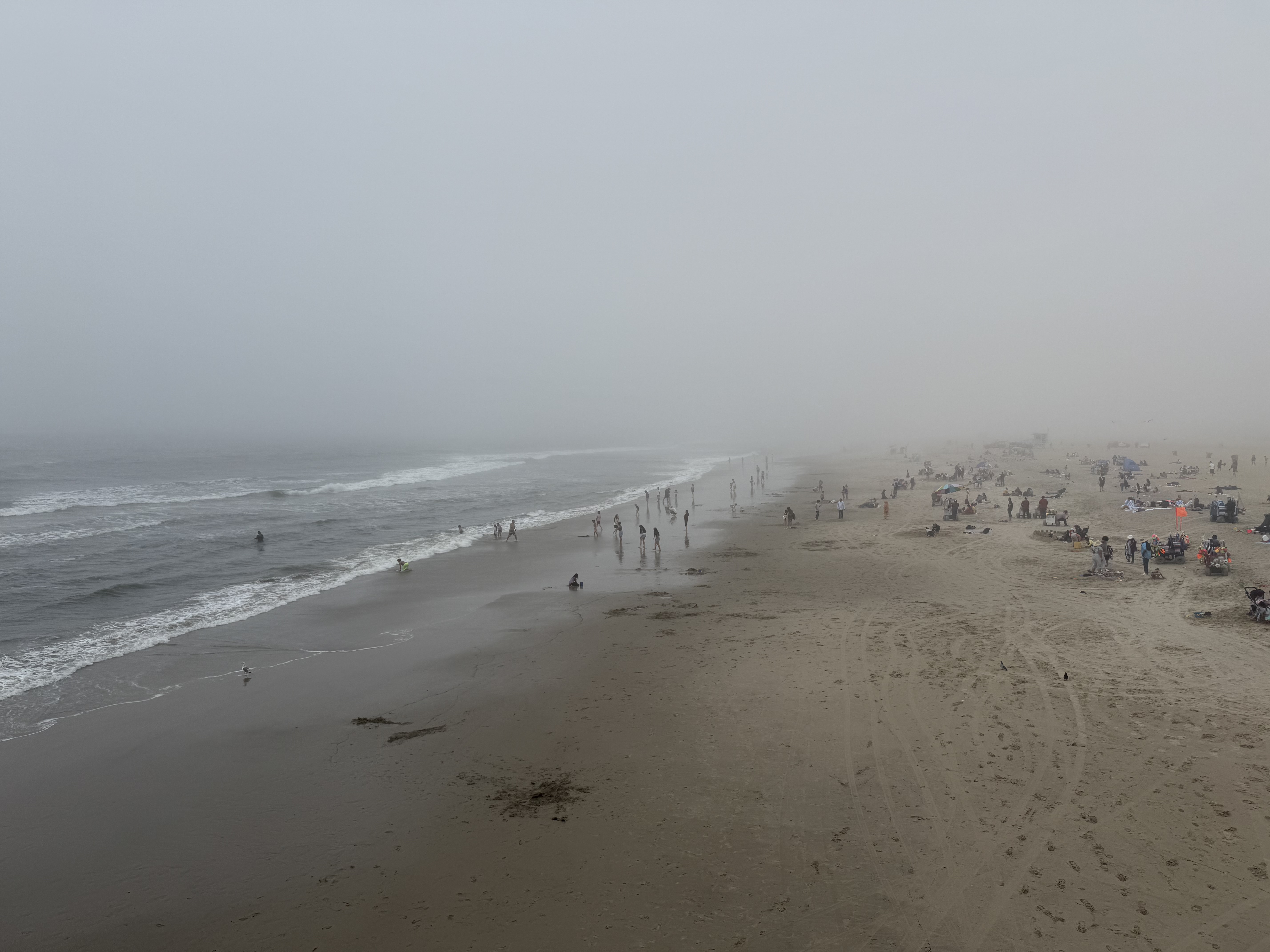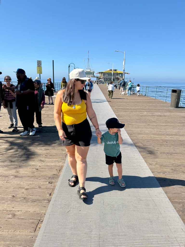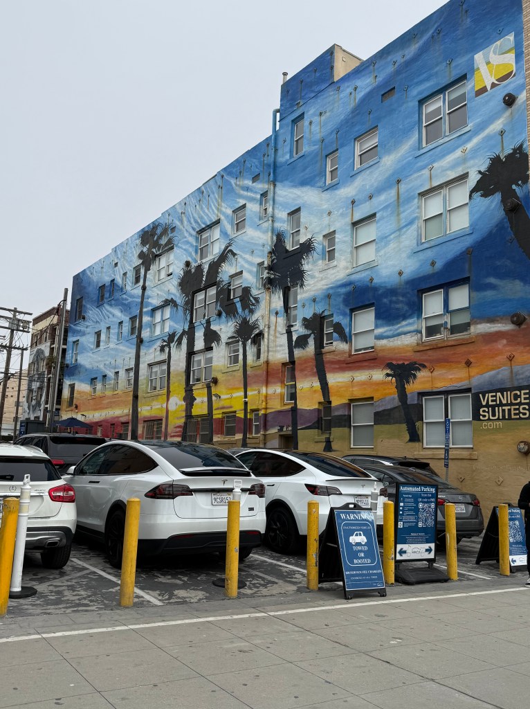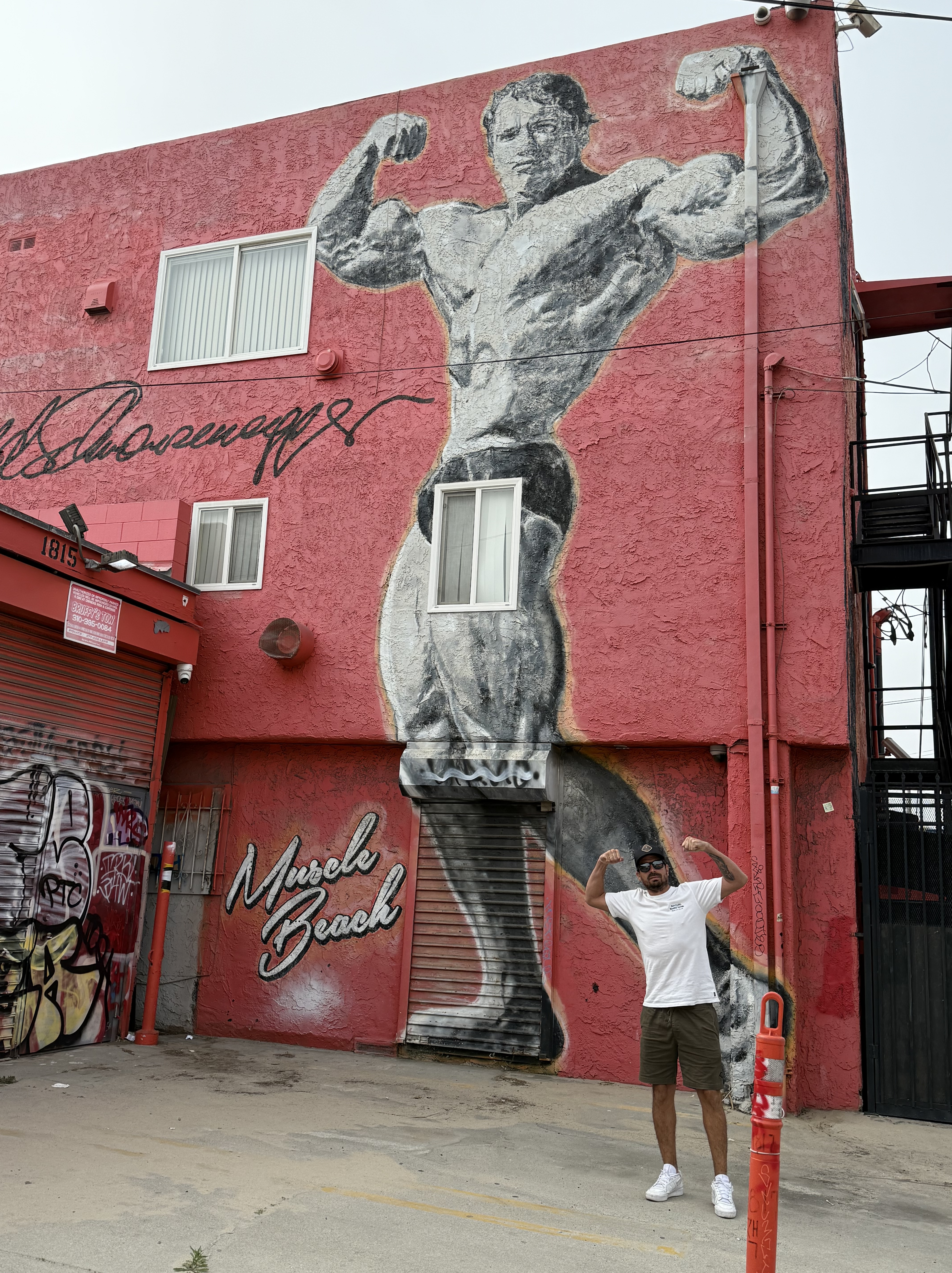 Nessa 1 hora e pouco que ficamos comendo, o tempo virou completamente, uma névoa/maresia/sei lá o que cobriu tudo e mal se via a roda gigante do parquinho no píer mais – além de ter esfriado. Fomos andando pela orla até Venice que era o plano inicial de qualquer forma na esperança que nosso filho dormiria no trajeto já que dá uns 40min caminhando – só que não hahaha. Achamos um parquinho no caminho e ficamos um pouco por lá antes de chegar no lugar que mais gostei de LA: Venice Beach!