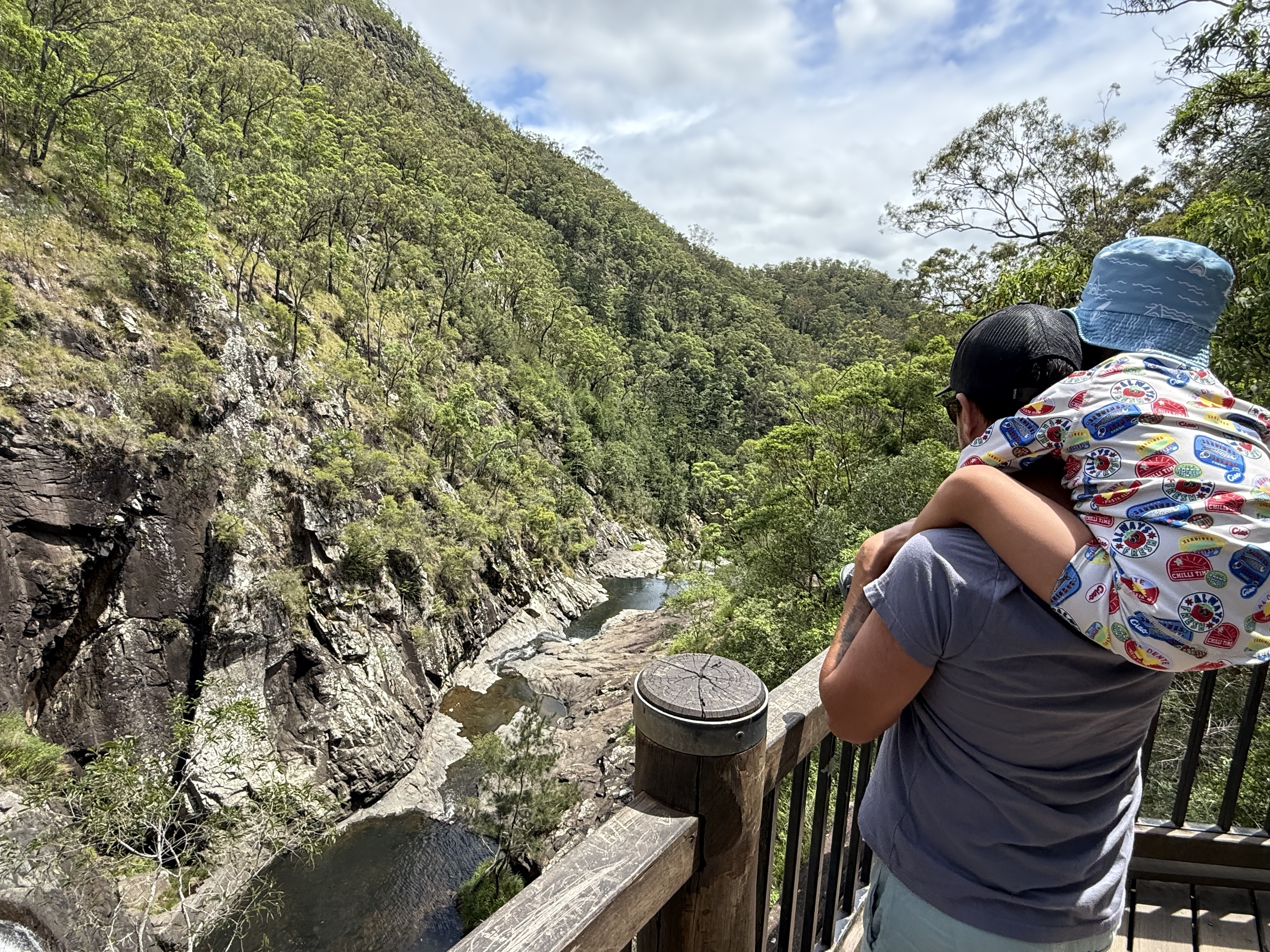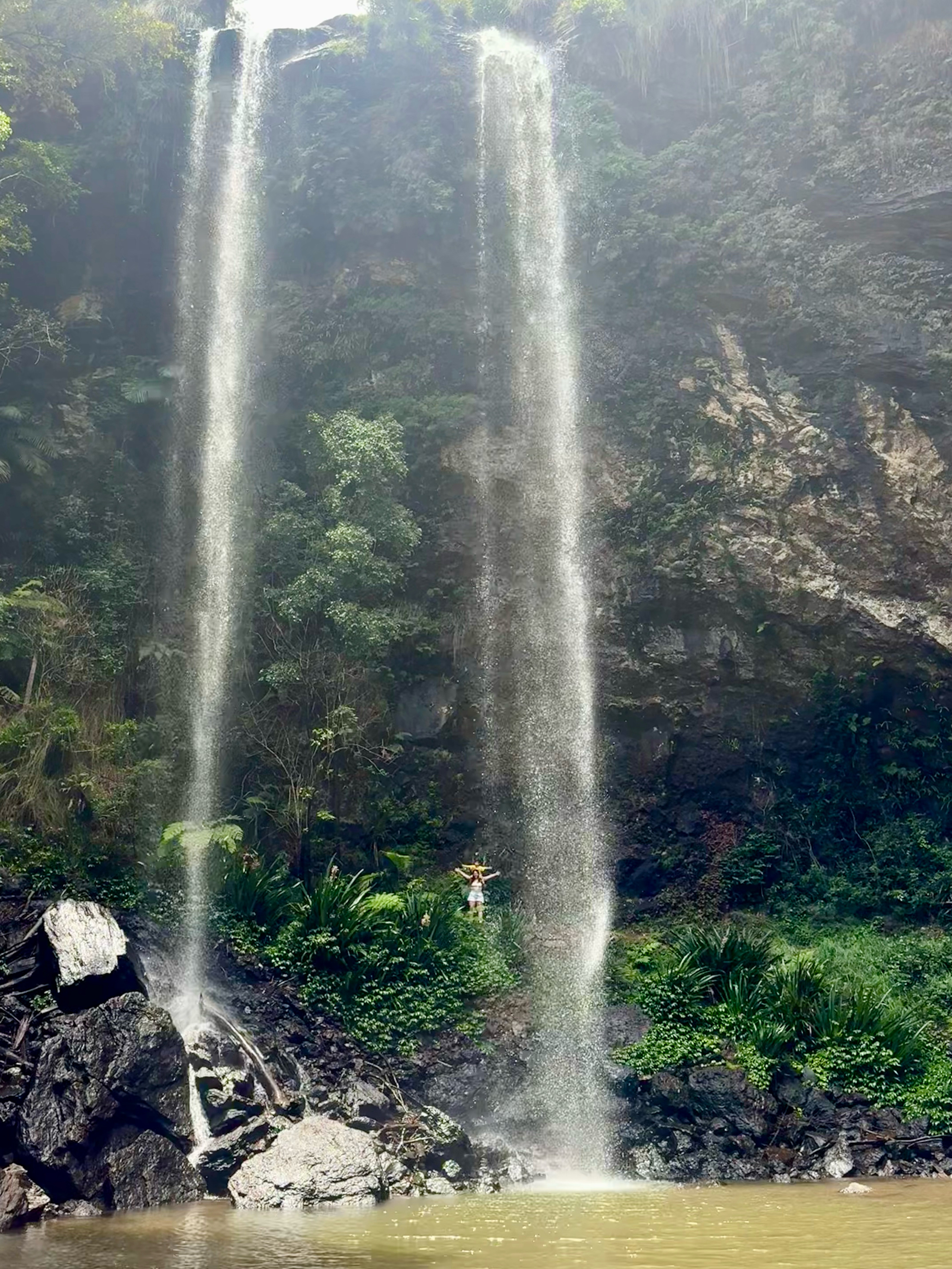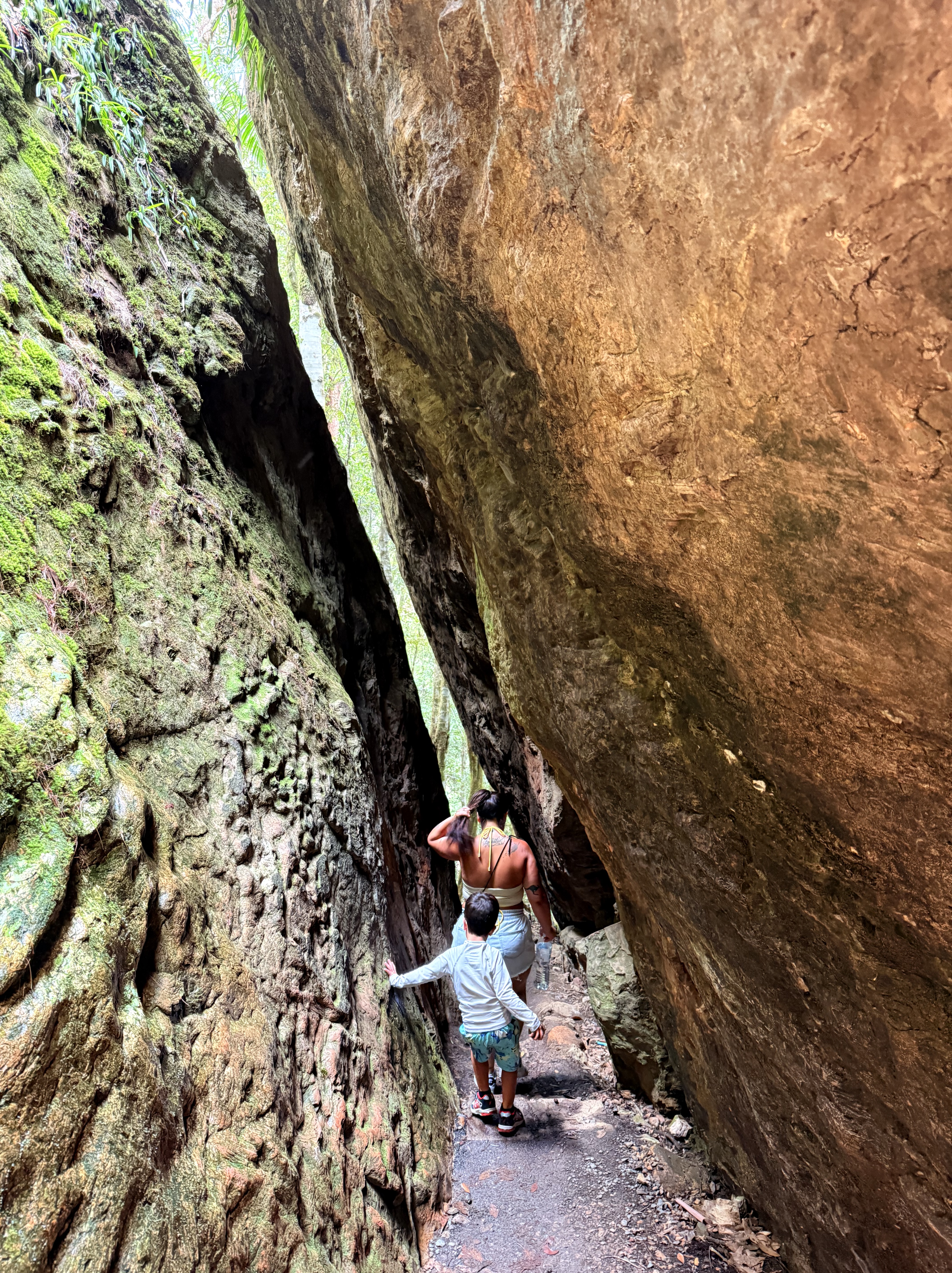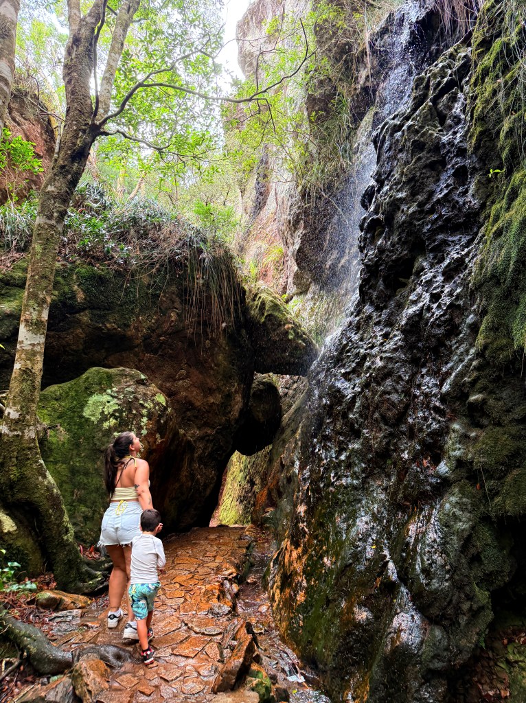 – Twin Falls: fica no Springbrook National Park e pra chegar lá é uma serrinha e eu amei! As informações dizem que a trilha é de nível moderado e leva 2 horas ida e volta, fomos de tênis, preparados para uma trilha que duraria mais do que isso, afinal estávamos com nosso filho de 4 anos mas no fim foi suuuuper tranquila. A trilha tem uma parte ou outra que requer mais atenção mas é bem tranquila, nada íngreme ou perigosa. Adoramos as partes aonde as pedras se encontram e temos que passar por baixo. Levamos 30 minutos na descida e 35 na subida, ou seja, um pouco mais de 1 hora ida e volta. A cachoeira é beeeem gelada, mas eu amo então foi tudo bem hehe. Ela tem duas quedas uma do lado da outra, por isso o nome Twin e é possível passar por trás das quedas, sensacional. Ah, vimos cobra por lá, então fiquem ligados.