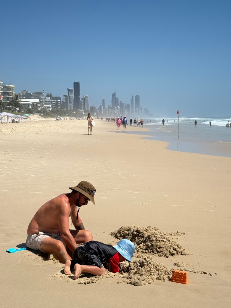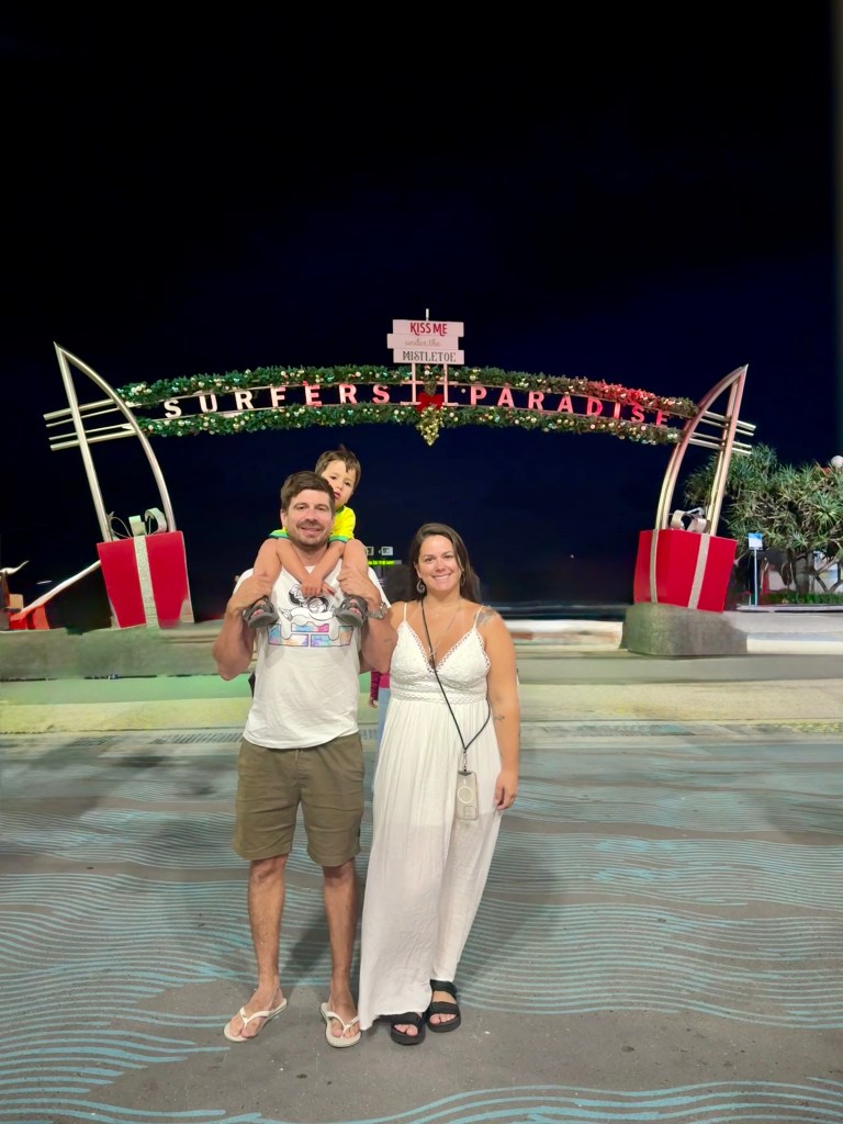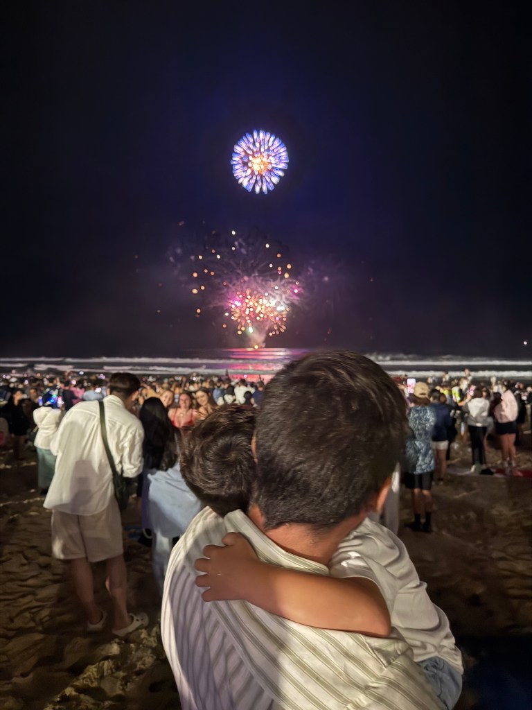 A virada do ano era pra ser em Coolangatta pois nunca tínhamos passado lá e era mais perto de Tugun mas minha cunhada disse que passaria em Broadbeach – aonde passamos outras vezes que viemos – então fomos pra lá. Queríamos ver os fogos das 8pm mas o Thomas dormiu bem quando chegamos e começou a chover, decidimos deixá-lo dormir e acordar pro da meia noite. Acabamos indo pra Surfers Paradise, estava cheio mas foi tranquilo. Ficamos um pouco no hotel (Novotel de Surfers) com o pessoal e na hora dos fogos eu, Vini e Thomas descemos pra ver os fogos da praia e pular as ondinhas e foi isso! Feliz 2026!